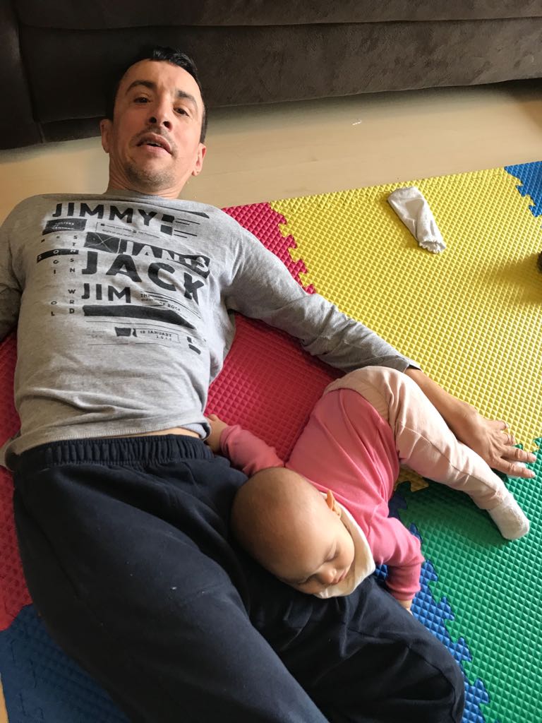 Quando Clara engatinha pelo apartamento, às vezes consigo evitar que se meta em situações perigosas, mas na maioria das ocasiões acabo precisando da ajuda de outra pessoa. Neste sábado, tentamos que Clara ficasse no antigo berço, que está improvisado como cercadinho, ou dormindo no carrinho, sem êxito. Silvia teve de deixa-la solta no E. V. A, fechou as portas, exceto a do quarto de Clara, onde tem uma caixa de brinquedos que esta gosta, e se trancou no nosso quarto para receber a massagem. Clara foi para lá seguida por mim, ao voltar para o E. V. A me deitei no único lado deste pelo qual poderia sair, brincou por 30 ou 40 minutos até que se deitou na minha coxa e dormiu. Pensei que teria de chamar Silvia ao menos uma vez nos 60 minutos da massagem, mas a sessão durou uns 90 e me virei sozinho.