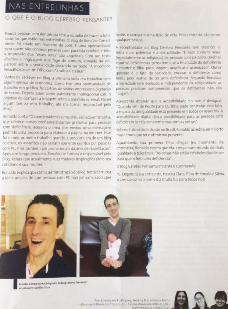 Ronaldo. Em 1998 fiz amizade com um empresário carioca – o sócio diretor da empresa que patrocina o blog – que viu meu site (não confundir com o blog), cujo pai tinha PC, e num momento muito difícil ele passou a me ajudar financeiramente, o que ele via como um prolongamento de seu amor pelo pai. Há dois anos, ele não pôde mais me ajudar informalmente e decidiu criar um blog patrocinado sobre PC. Era para ser um blog coletivo, cujo conteúdo seria produzido não só por gente com PC, mas também por pais, médicos, fisioterapeutas, etc, desde que os textos fossem sempre em primeira pessoa, que ele próprio iria arranjar, enquanto eu apenas ficaria com a administração do blog e só eventualmente escreveria. Na época, tinha parado de escrever há muito tempo, me sentia totalmente sem inspiração para tanto e fiz tudo para me esquivar de produzir o conteúdo. Porém, esse amigo nunca teve tempo para conseguir colaboradores e, contra minha vontade, acabei como o único responsável pelo blog.