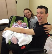 Nas duas primeiras consultas da nossa filha com a pediatra, fomos acompanhados e ajudados pelo meu irmão – que nos aconselhou a não irmos sozinhos – e por uma irmã de Silvia. Na primeira delas, entramos no consultório em si sozinhos, com nossa filha num bebê conforto, este no meu colo e Silvia empurrando minha cadeira de rodas. Achei que também podia fazer assim todo o trajeto do estacionamento ao consultório, já que a calçada da rua é boa e tem rampa, temendo só descer esta – mas a descida de ré foi segura. Hoje, nossa filha completou dois meses, tinha outra consulta, resolvemos ir sem ajuda, Silvia teve certo trabalho para nos colocar e tirar do carro e tivemos êxito.